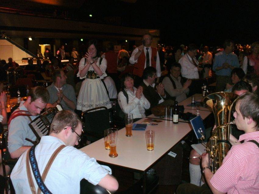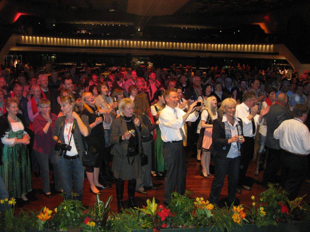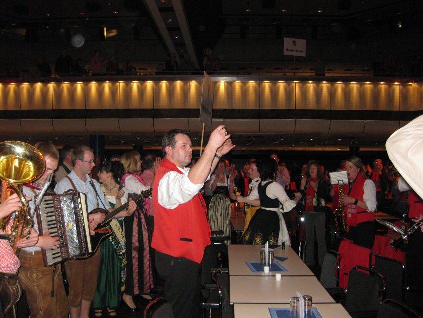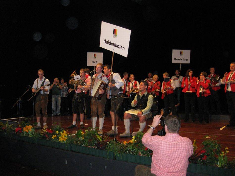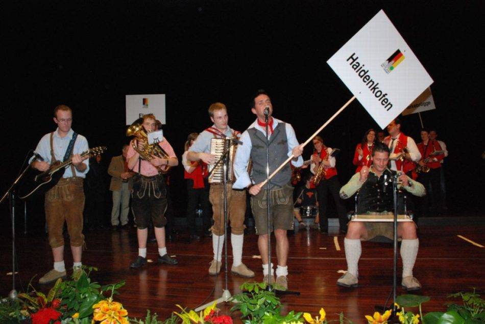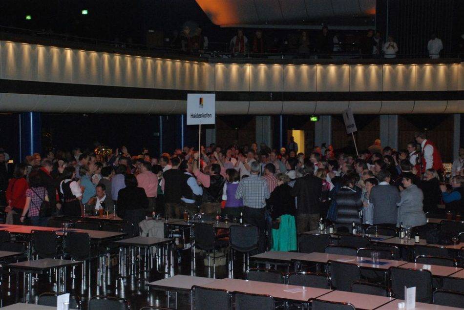 Das musikalische Rahmenprogramm bei diesem Dorffest traf nicht ganz den Geschmack der meisten Teilnehmer. Über drei Stunden lang hörten sie von Gospelsong bis Trommelsolo alles, nur keine charakteristische Musik der verschiedenen Bundesländer. Die anderen bayerischen Dörfer hatten die Veranstaltung bereits verlassen, als das kleinste aller Siegerdörfer, das laut Ministerin Aigner an ein kleines gallisches Dorf erinnert, seinen großen Auftritt hatte. Die drei Grünner Buam begannen mitten im Publikum zu spielen, und die Musikkapelle aus Harkebrügge (Niedersachsen), die ebenfalls nicht auftreten durfte, stimmte sofort mit ein. Gemeinsam brachten sie in kürzester Zeit eine riesige Stimmung in den Saal. Das Publikum klatschte begeistert mit und zog mit den Haidenkofener in einer langen Polonaise zur Bühne. Dort angekommen spielten die Bayern und Niedersachsen zusammen Volksmusik. Das traf genau den Geschmack der Zuhörer. So wurde es doch noch ein zünftiges Dorffest, bei dem es niemanden mehr auf den Sitzen hielt. Jetzt tanzten alle Vertreter der Siegerdörfer ungezwungen und befreit miteinander. In der letzten Stunde verstand es auch der DJ, die richtige Musik aufzulegen. Nun ging die Post ab und es rockte sprichwörtlich der Bär in Berlin. Erst um 23:30 Uhr fuhr man gemeinsam, für einige immer noch zu früh, ins Hotel "Ramada-Berlin Mitte" zurück.