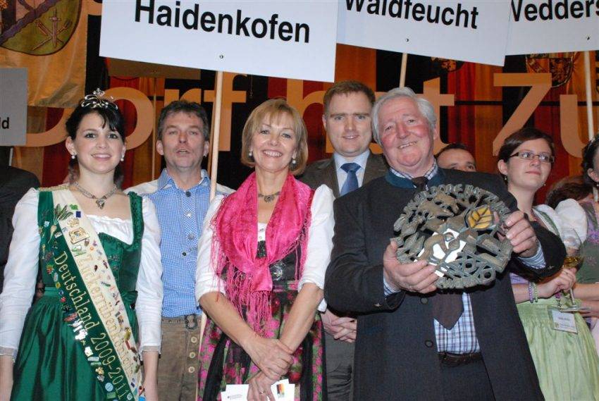 Unter der Schirmherrschaft des Bundespräsidenten hatten insgesamt 3300 Dörfer an diesem 23. Bundeswettbewerb teilgenommen. Bundeslandwirtschaftsministerin Ilse Aigner ehrte im Rahmen der Internationalen Grünen Woche die 30 Gewinner dieses Bundeswettbewerbes, der eine der größten Bürgerinitiativen in Europa ist. Rund 3000 Bürgerinnen und Bürger aus diesen Siegerdörfern waren nach Berlin gekommen, um die Gold-, Silber- und Bronzemedaillen in Empfang zu nehmen und gemeinsam zu feiern. In Bühnennähe hatten die Haidenkofener ihren Platz ergattert und erlebten so hautnah die Preisverleihung mit, bei der ihnen auch MdB Peter Aumer die Ehre gab. In ihrer Festansprache hob die Bundesministerin hervor, dass jeder Einzelne Sieger sei, weil er sich für sein Dorf eingesetzt habe. "Ihr Engagement ist der Kern dieser Entwicklung und wir werden das fortsetzen", versprach sie. So sei es ihr ein Anliegen, jedes einzelne Dorf persönlich zu würdigen, denn "die Rezepte für eine gute Zukunft kommen nicht von oben, nein sie kommen von Ihnen!", dankte sie den Siegern.