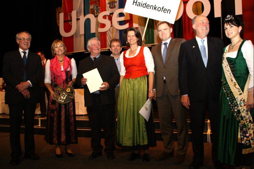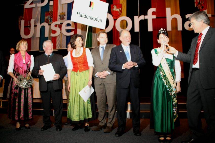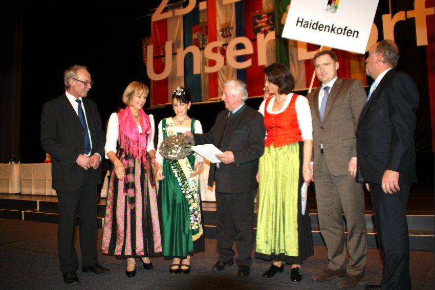 Höhepunkt des Abends war die Auszeichnung der dreißig Dörfer. Die Stimmung in der Festhalle war wie bei einer Olympiade. Bei jedem Dorf, das aufgerufen wurde, brandete Jubel auf und unter dem Blitzlichtgewitter der Kameras wurde der entscheidende Moment festgehalten. Stellvertretend für die 99 Dorfbewohner aus Haidenkofen nahmen Bürgermeister Erwin Rist, Christina Rominger, Eva Gerl und Stephan Bayerschmidt eine der acht vergebenen Goldmedaillen, in Form eines Bronzereliefs, sowie eine Urkunde aus der Hand der Ministerin entgegen. Auf so einer großen Bühne vor 3000 Leuten im Saal zu stehen war Gänsehaut pur für die Abordnung. Über Haidenkofen sagte die Ministerin "Haidenkofen sei ein kleiner Ort mit nur 99 Einwohnern. Wie einst ein kleines, gallisches Dorf könne es der Ort mit der ganzen Welt aufnehmen. Kaum ein Haidenkofener, der nicht in einem der fünf Vereine aktiv ist. Die dort erzeugte Energie übersteigt den Bedarf um das Fünffache und schafft damit Wertschöpfung."