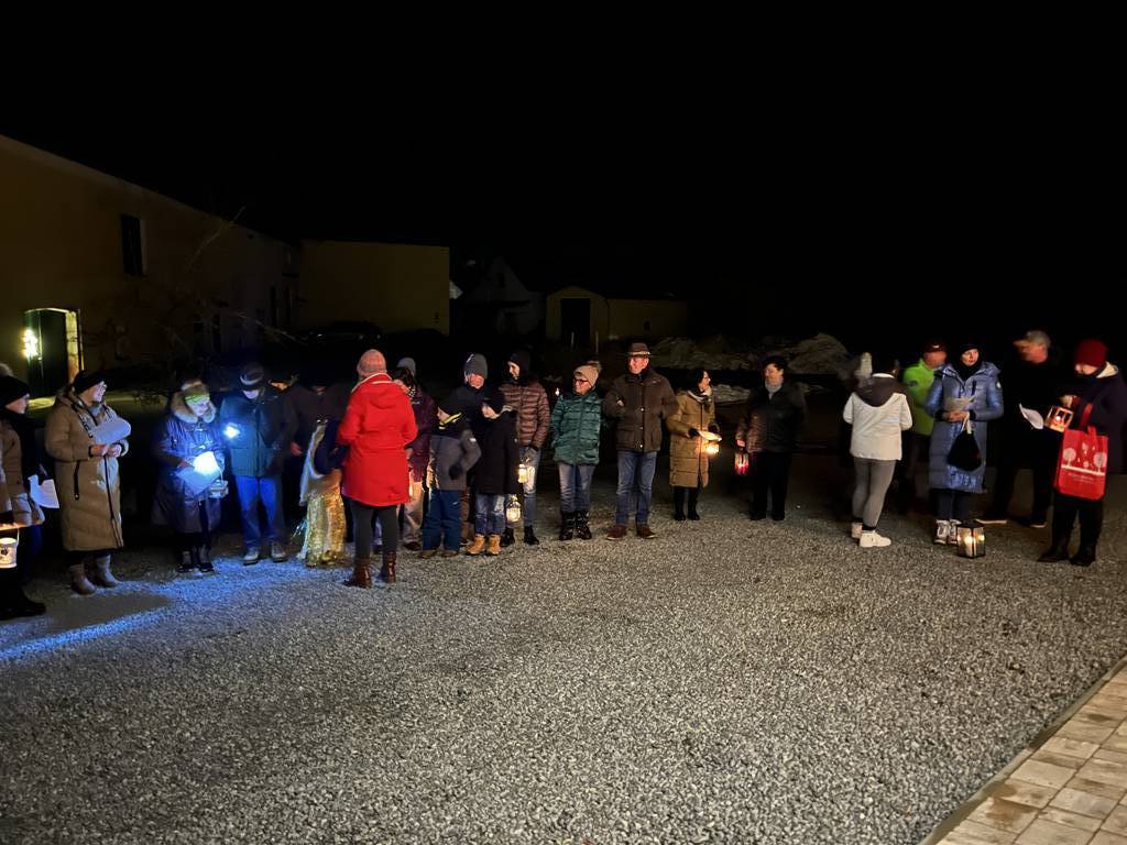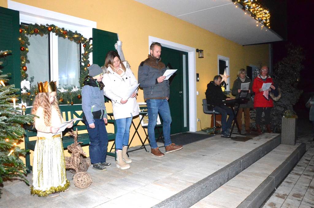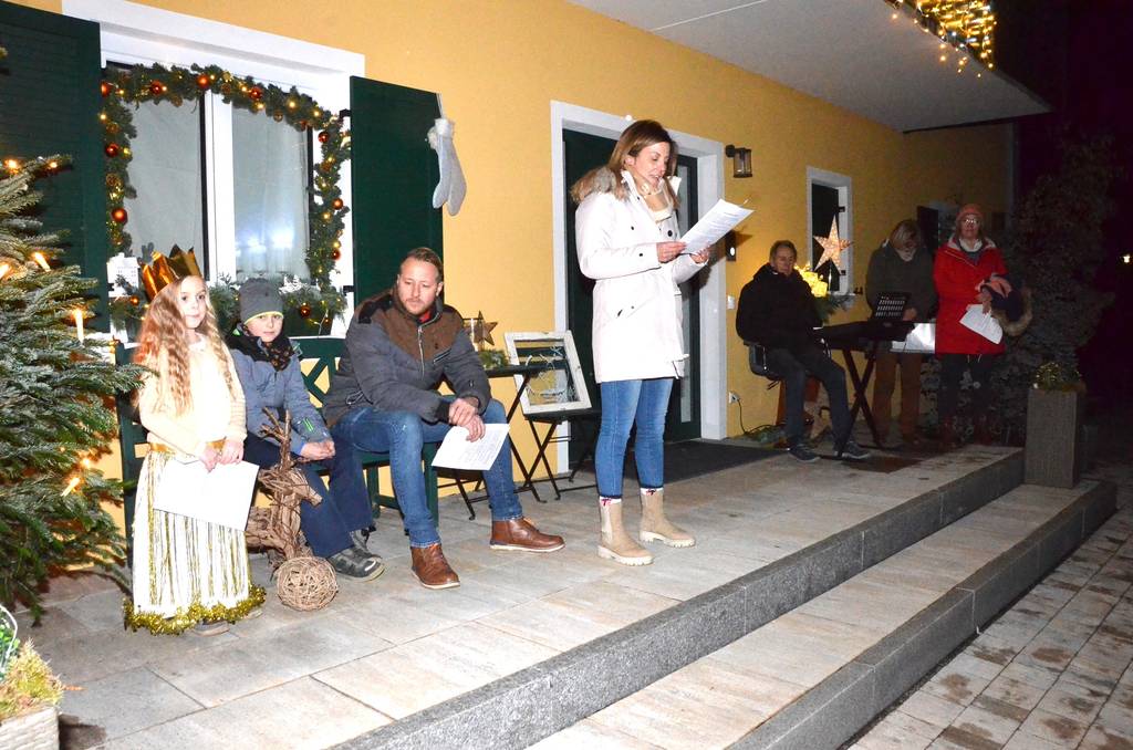 Am vergangenen Freitag war es wieder soweit. Ganz in der Nähe des Ausgangpunktes befindet sich der Hof von Alexander und Katja Gerl. Schon von Weitem zeigte der helle Lichter- und Kerzenschein den Weg vor das Wohnhaus des landwirtschaftlichen Betriebs zum heurigen Adventsfenster.