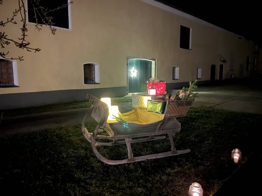 Seit geraumer Zeit liefen die Vorbereitungen bei den Gerls, fleißig wurden Plätzchen gebacken, Geschichten und Liedtexte ausgesucht. Am Freitag wurden Tische aufgestellt sowie der Hof mit Tannengrün und Kerzen adventlich dekoriert. Sehr zur Freude der Hausherrin hatte ihr Ehemann einen alten Pferdeschlitten hervorgeholt, der sich bereits seit 60 Jahren im Stadel auf einem Balken unter dem Dach befunden hat und jetzt, vorm Stall platziert für nostalgische Stimmung sorgte.