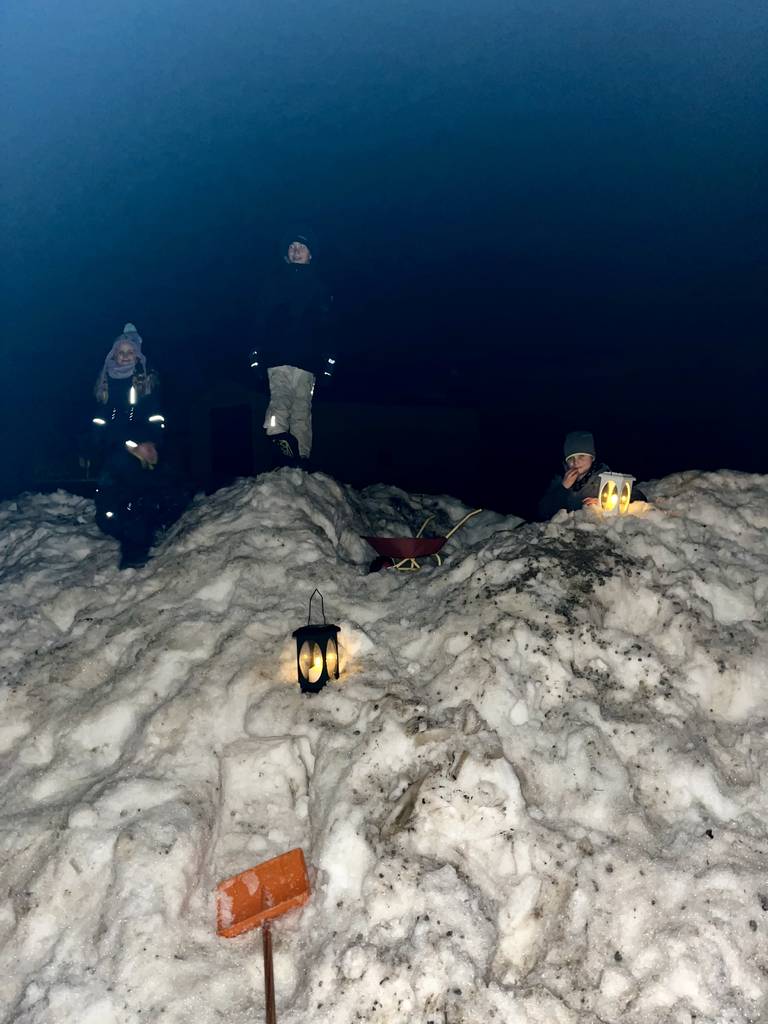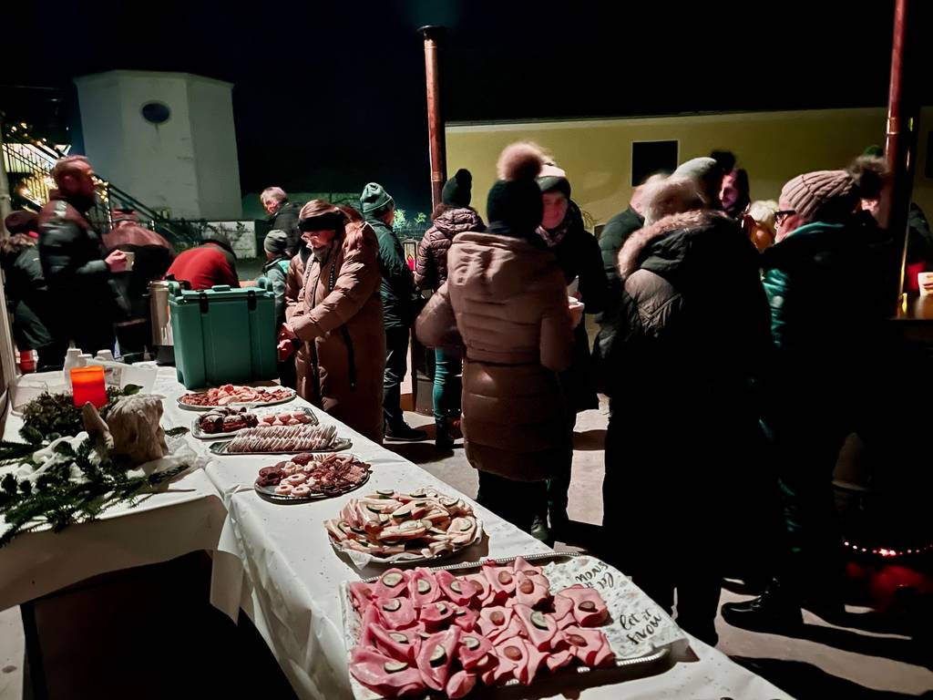 Nach dem besinnlichen Teil verbrachten die Gäste mit verschiedenen Leckereien, Glühwein und kalten Getränken noch schöne Stunden rund um die beheizten Stehtische, während die Kinder auf den aufgetürmten Schneehaufen tollten.