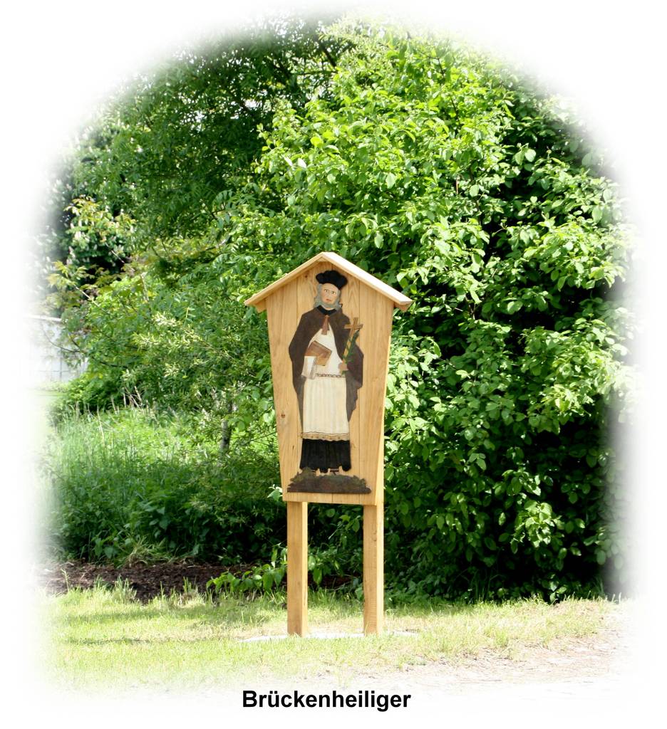 Warum der Johannes Nepomuk als Brückenheiliger verehrt wird, hat folgenden Grund: Der Geistliche entstammte vermutlich einer deutsch-böhmischen Familie und wurde nach einem kirchenpolitischen Konflikt mit König Wenzel IV. gefangen genommen und in Prag am 20.03.1393 schließlich von der Karlsbrücke aus in der Moldau ertränkt. Nach der Legende, die zur Heiligsprechung des Johannes von Nepomuk führte, war der Anlass des Streites mit dem König seine Weigerung, das Beichtgeheimnis zu brechen. Demnach habe der Priester dem König nicht preisgeben wollen, was dessen von Wenzel der Untreue verdächtigte Frau ihm anvertraut habe. Seit dieser Zeit ist Nepomuk der Patron der Flößer, Müller, Schiffer und Brücken sowie der Beichtväter und Priester. Nepomuk, der im Veitsdom zu Prag seine Grabstätte hat, wird bereits seit dem 1600 Jahrhundert in Böhmen als Landesheiliger verehrt.